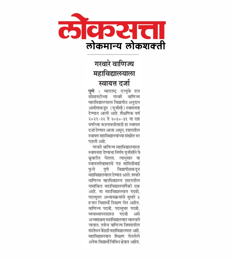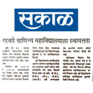 MES Garware College of Commerce is one of the leading prestigious autonomous educational institutes in Pune, that offers degree courses in the field of commerce and is affiliated to the Savitribai Phule Pune University (SPPU). Garware College of Commerce has been empowering generations since 1947 by imparting quality education in the field of commerce and management. The College has been re-accredited by NAAC with an “A” grade (CGPA 3.45) in its third cycle. The College is also the recipient of the “Best College Award” by Savitribai Phule Pune University.